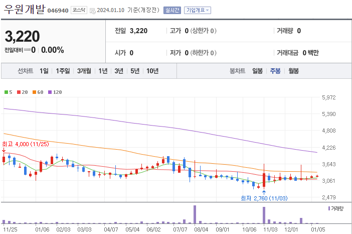 바닥주 차트를 둘러보다가 우원개발을 발견했고 뉴스검색으로 이슈가 있는지 확인했다.