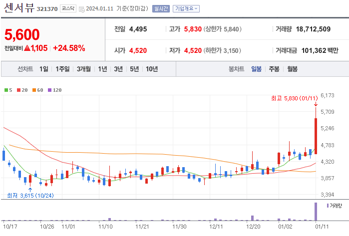 센서뷰의 주가가 상승세다. 국내 최대 종합반도체 기업에 반도체 장비용 부품을 공급을 시작한다는 소식이 알려지면서다.11일 오후 1시26분 기준 센서뷰는 전 거래일 대비 390원(7.91%) 오른 5320원