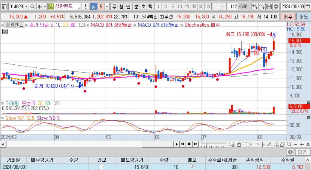 상승 추세에서 장대양봉이 나온후 스토캐스틱 슬로 기준 매수 신호 즈음에 모아들어가기로 했다.